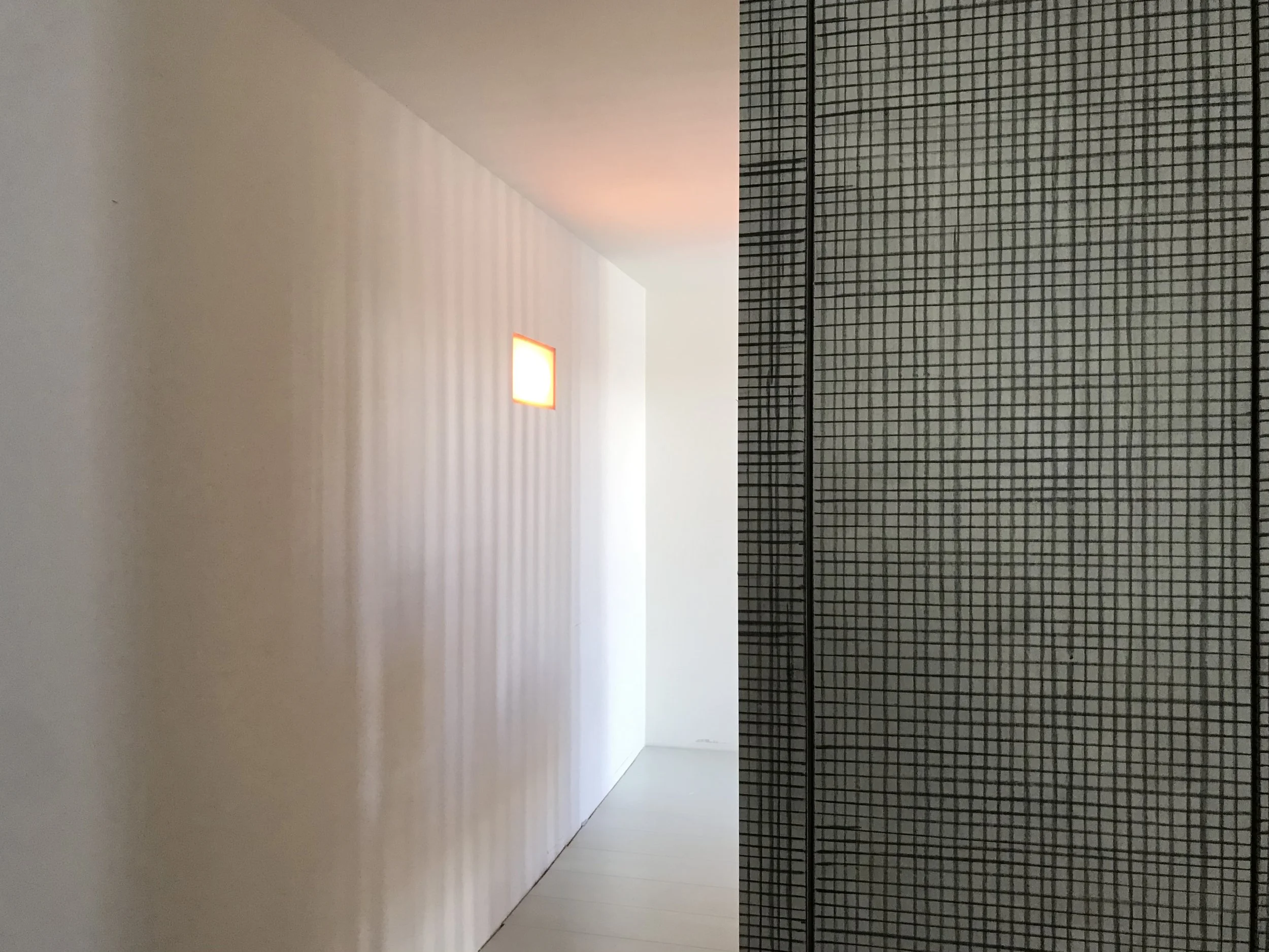Bij bovenkomst op de eerste verdieping is de overloop tegelijkertijd een soort tussenkamer met garderobekasten. Onder de trap naar de vide in de woonkamer zit daar aan die kant een boekenkast, maar hier op de overloop, een hoge hangkast en een aantal laden. Toevalligerwijs precies op de juiste plek, op weg naar de badkamer.
