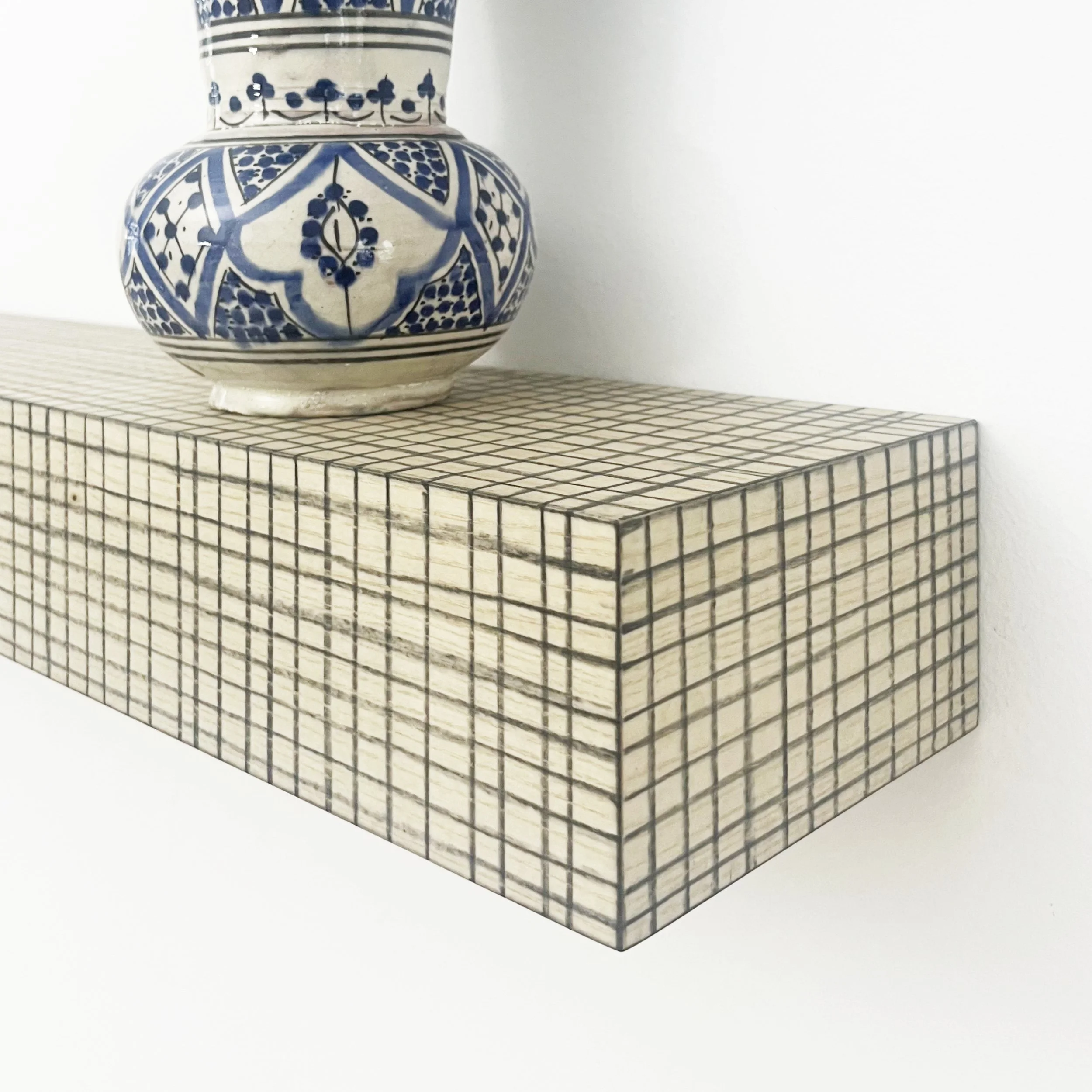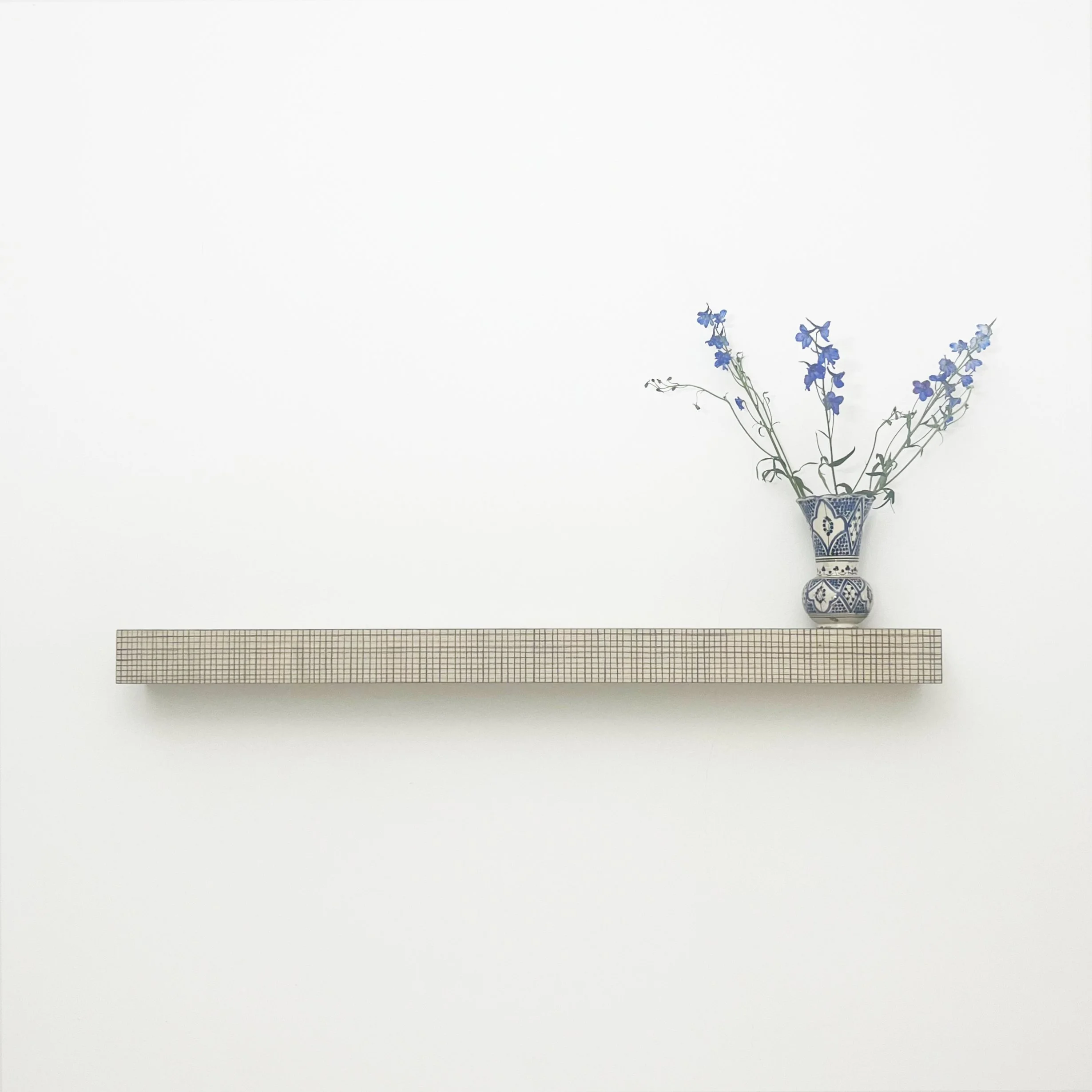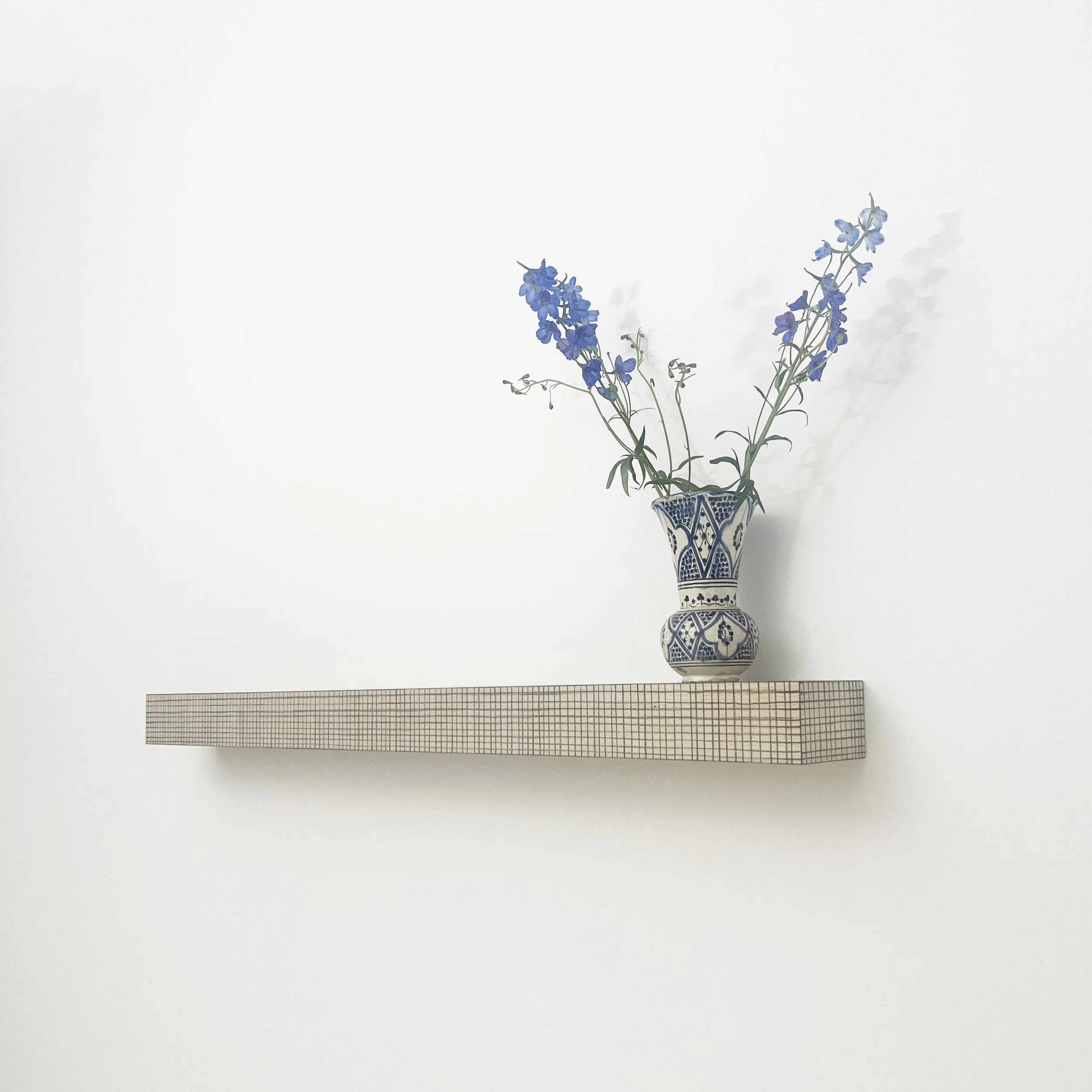 Wandobject, betekend met hand getrokken houtskool lijntjes. Het balkje op de foto is (b x d x h): 1300 x 140 x 90 mm. Andere maten mogelijk.